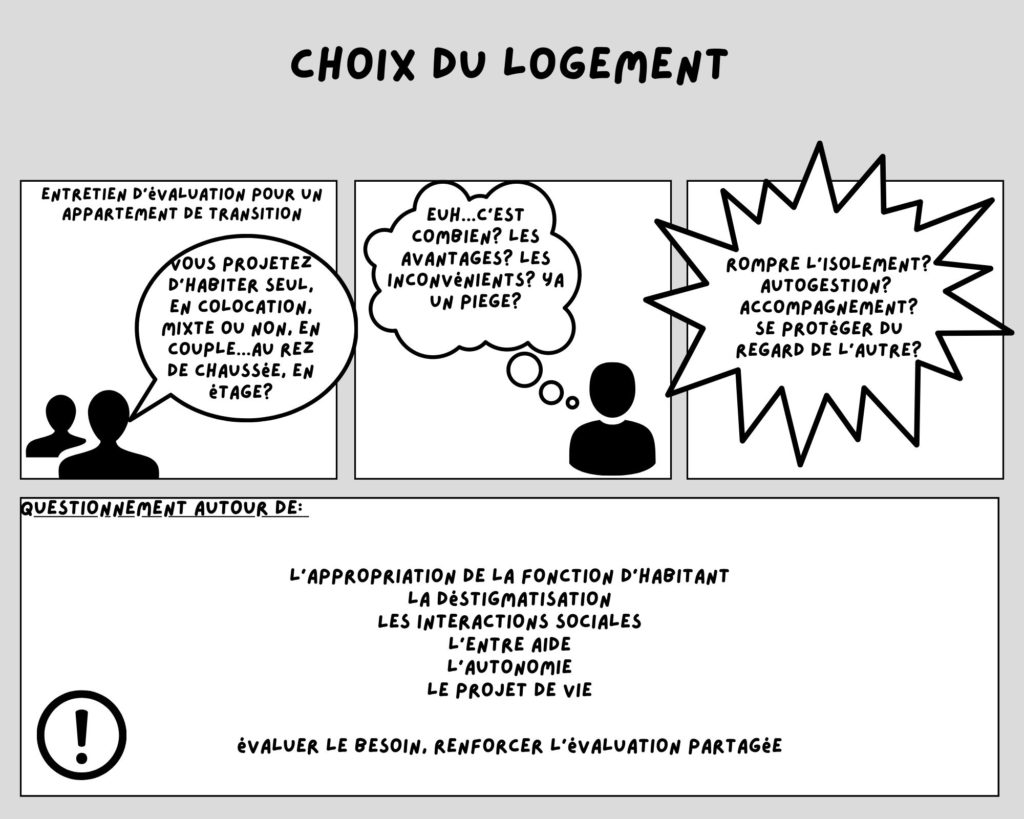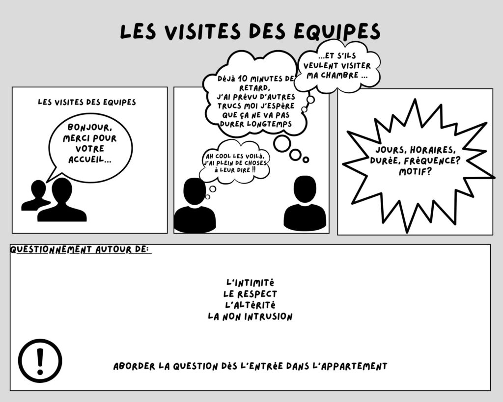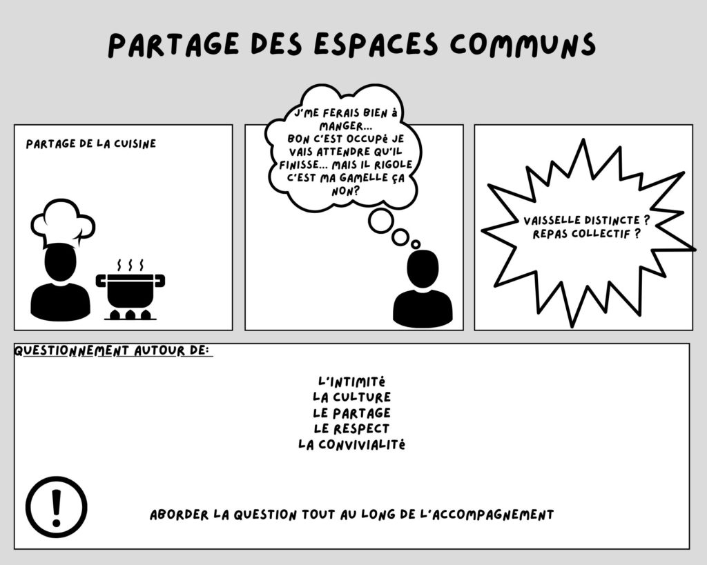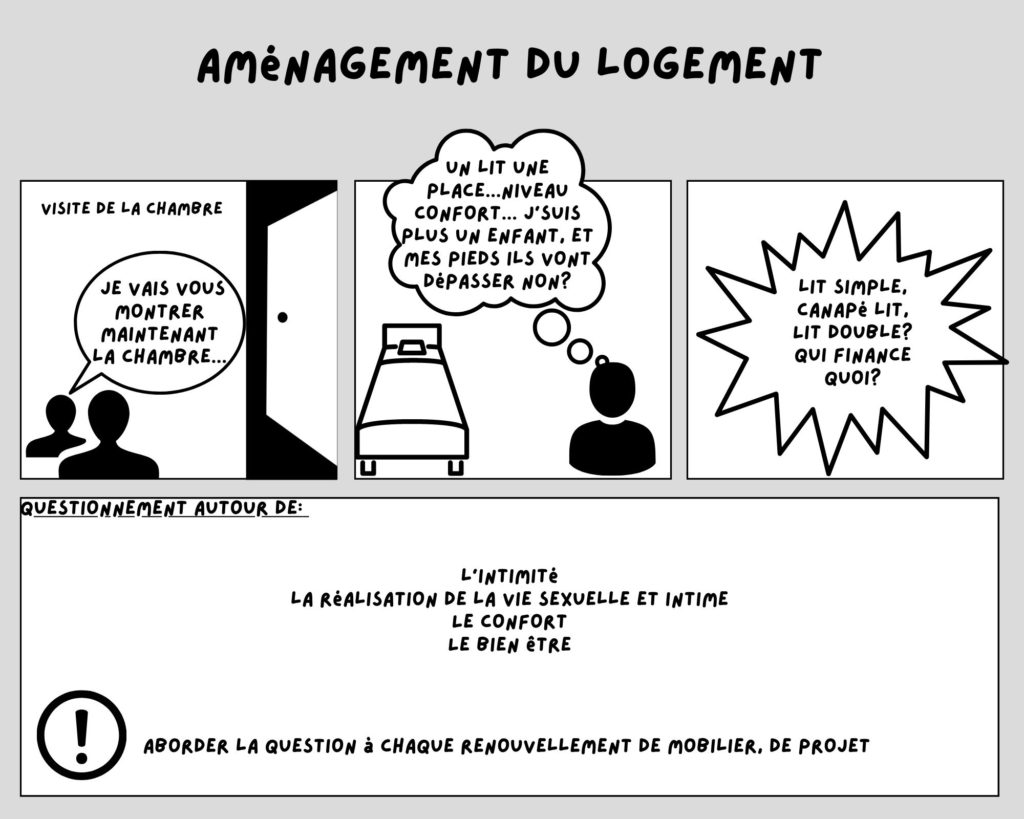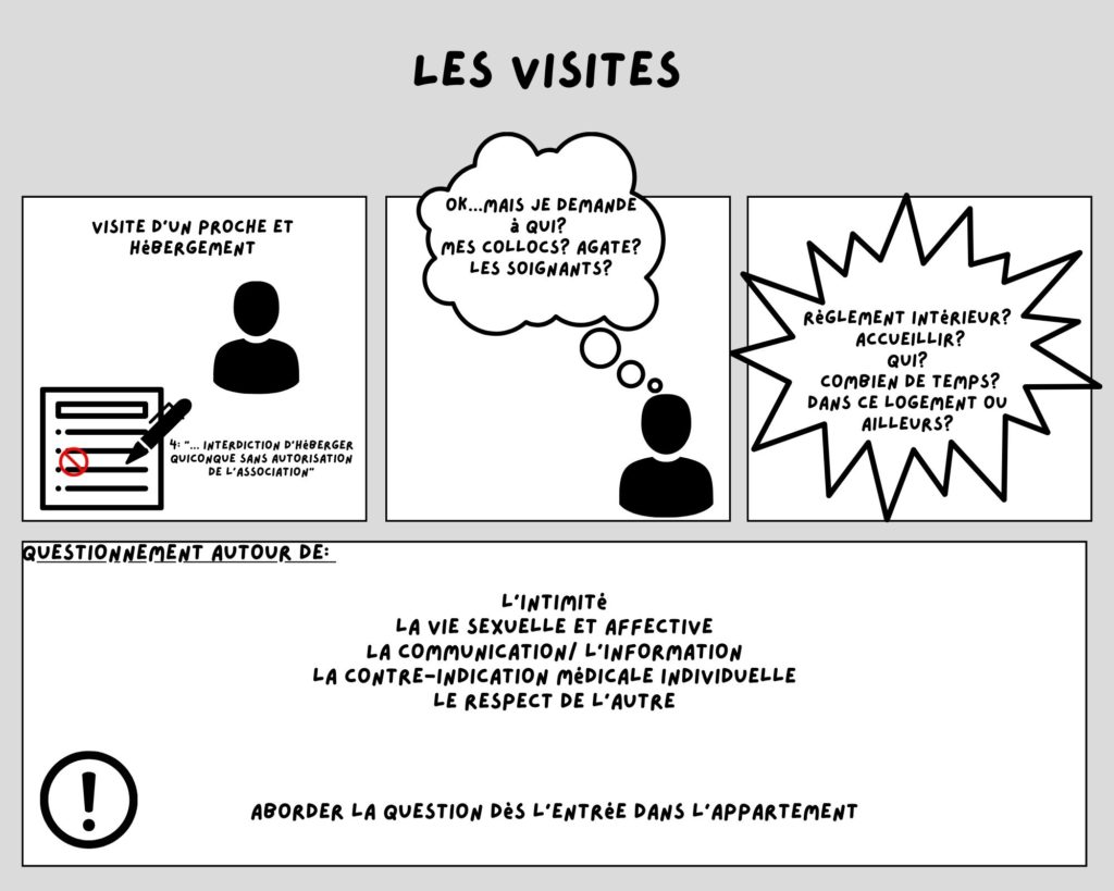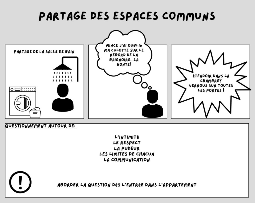 De janvier 2022 à juin 2023 un groupe de travail réunissant des représentants des résidents et des membres du conseil d’administration a travaillé sur la question du respect de l’intimité dans les logements et notamment dans les logements partagés. Ce travail qui a été présenté au public en février 2024 lors des « vingt ans d’Agate » a fait l’objet d’une restitution en bande dessinée que vous pouvez découvrir ci dessous.